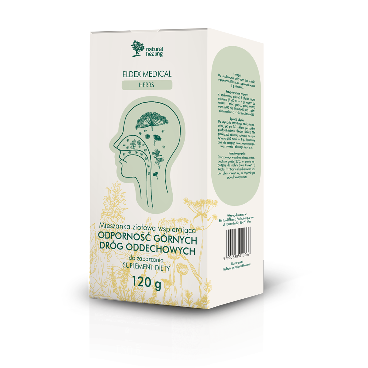 Starannie dobrane składniki ziołowe, wspierające odporność górnych dróg oddechowych. Podbiał wspomaga odkrztuszanie i odporność organizmu. Majeranek i arcydzięgiel wspierają odporność organizmu przyczyniając się do jego ochrony przed czynnikami zewnętrznymi. Hyzop wspomaga łagodzenie podrażnień jamy ustnej i gardła. Podobnie prawoślaz i miodunka, wspomagają dobrą.