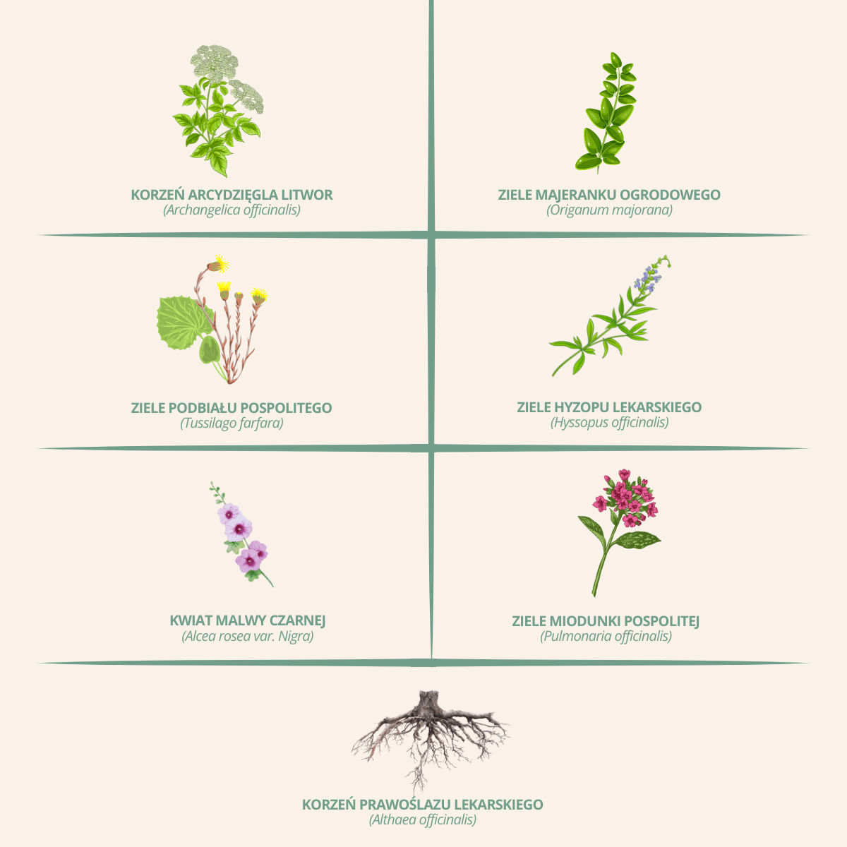 Ziele Miodunki plamistej (Pulmonaria officinalis), kwiat Malwy czarnej (Alcea rosea var. Nigra), korzeń Prawoślazu lekarskiego (Althaea officinalis), ziele Hyzopu lekarskiego (Hyssopus officinalis), ziele Podbiału pospolitego (Tussilago farfara), ziele Majeranku ogrodowego (Origanum majorana), korzeń Arcydzięgiel litwor (Archangelica officinalis).