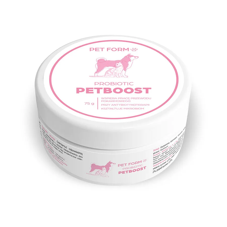 PETBOOST PROBIOTIC to mieszanka paszowa uzupełniająca dla psów i kotów, wspomagająca prawidłową pracę przewodu pokarmowego. Produkt przeznaczony do zwierząt, u których występują zaburzenia mikroflory jelitowej.