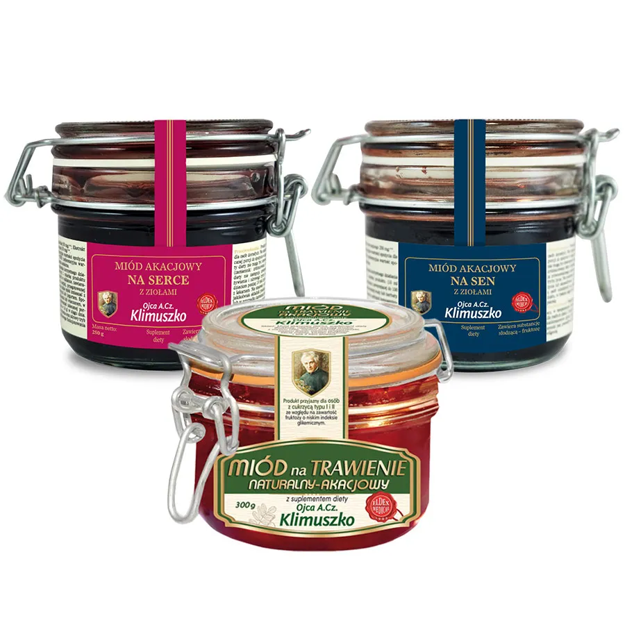 Nasz zestaw to harmonijne połączenie mądrości pokoleń, zawartej w ziołowych recepturach Ojca Klimuszki, z naturalnym bogactwem polskiego miodu akacjowego. To przemyślany, elegancki i przede wszystkim płynący z serca prezent, który pomoże zadbać o dobre samopoczucie bliskiej Ci osoby.